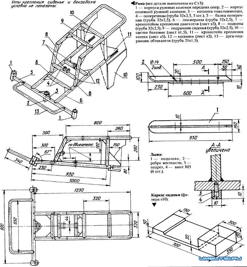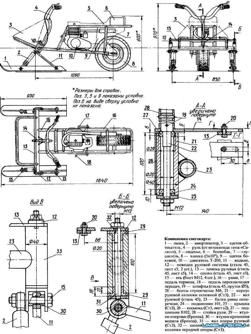 Вал рулевой колонки вращается в двух подшипниках. Верхняя его часть вытачивается по внутреннему диаметру рулевой стойки и фиксируется в ней двумя штифтами. К этой же его части приваривается и сошка рулевого механизма. При повороте руля в ту или иную сторону она через планку разворачивает одновременно оба поводка передних опор. Поводки, укрепленные на рулевых валах опор с помощью шпонок, обеспечивают соответствующий угол разворота водил и лыж. В колонках опор вместо подшипников применены бронзовые втулки (можно установить капроновые или фторопластовые). Вал опоры имеет проушину, служащую для навески амортизатора и водила. Последние насажены на общую ось также через бронзовые втулки и шайбы. В качестве амортизаторов передних опор использованы стандартные мопедовские.