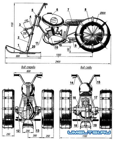 Полностью самодельные — это опорно-управляющая лыжа и колеса опорно-ведущих пневматиков Описания лыжи и колес не раз приводились на страницах журнала «Моделист-конструктор», причем в различных вариантах Читателям журнала, решившим изготовить подобный снегоход, есть из чего выбрать Поэтому подробное описание как конструкции, так и изготовления приводить не буду — это понятно из приведенных чертежей.