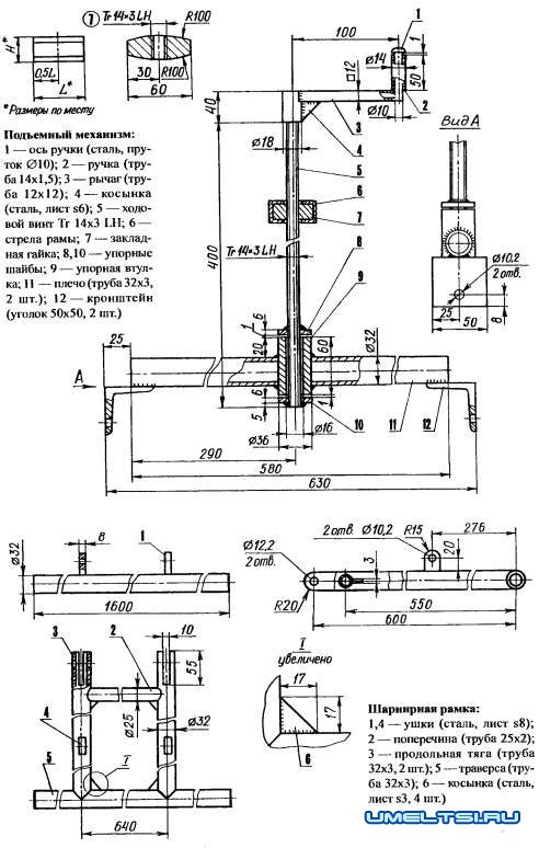 Подъемный механизм состоит из ходового винта с левой трапецеидальной резьбой Тг 14x3 LH (можно использовать винт и от «жигулевского» домкрата), ручки и двуплечей подъемной планки. Планка сварена из упорной втулки, двух плечей — отрезков трубы 32x3 мм и двух кронштейнов — отрезков уголка 50x50 мм.