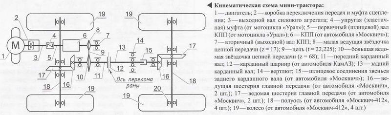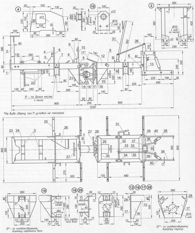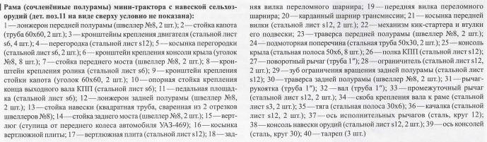 К задней полураме сзади приварена стойка, выполненная из прямоугольной трубы 80x80 мм (сварена из двух отрезков швеллеров №8, состыкованных кромками полок) для монтажа на ней навески, к которой подцепляются почвообрабатывающие и другие сельскохозяйственные орудия. А спереди — вертикальная плита для вертлюжного узла (о нём — позже), подкреплённая с обеих сторон косынками. И стойка, и плита выполнены всё из того же 12-мм стального листа. Сверху полурама накрыта настилом из листовой стали толщиной 3 мм. Впереди впоследствии крепится ещё площадка из такого же стального листа, прикрывающая «переломный» узел. На ней монтируются педали «газа» и сцепления. Полурамы соединены между собой «переломным» узлом, представляющим собой плоский (одноосный) карданный механизм (шарнир). Его вилки сварены из стального 12-мм листа. Причём стенка передней вилки приварена непосредственно к задней траверсе передней полурамы и подкреплена косынками. Рожки вилок тоже усилены небольшими косынками из такого же стального листа. Цапфы и корпуса подшипниковых опор для этого шарнира отрезаны и использованы вместе с подшипниками и стопорными шайбами от соответствующих узлов карданного вала автомобиля КамАЗ.