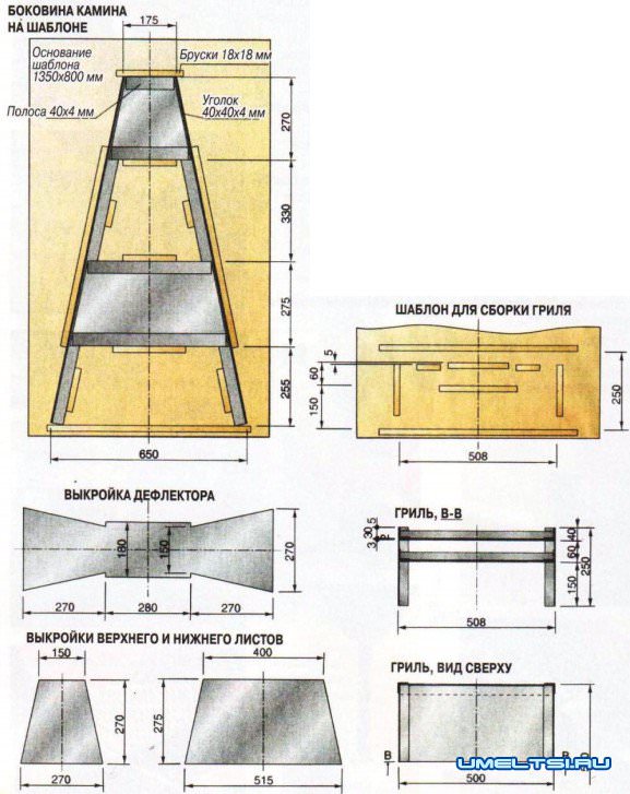 Процесс изготовления гриля довольно прост. Колосник и зольник крепят между четырьмя угловыми опорами-ножками. Для строгого соблюдения прямоугольности всей конструкции следует использовать вспомогательный шаблон. Хоть конструкция гриля и проста, нужно очень внимательно следить за тем, чтобы болты в углах не мешали друг другу.