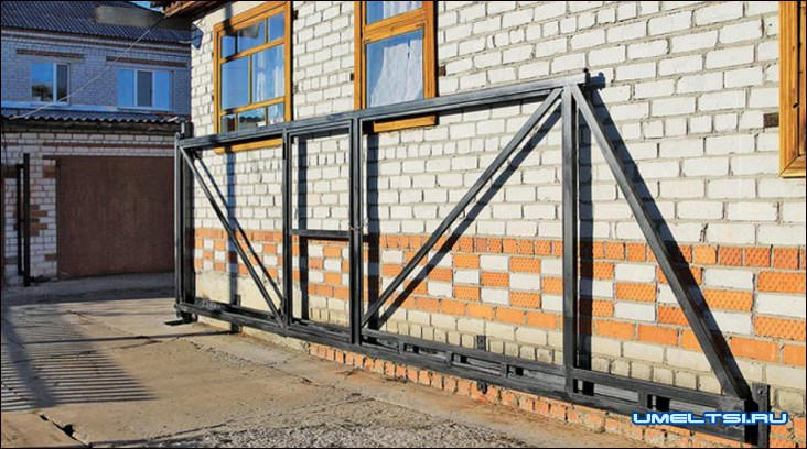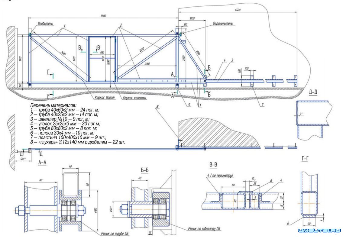 Конструкция сдвижных ворот имеет четыре основных узла: