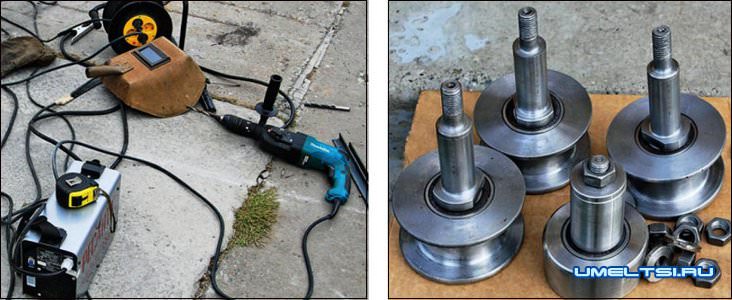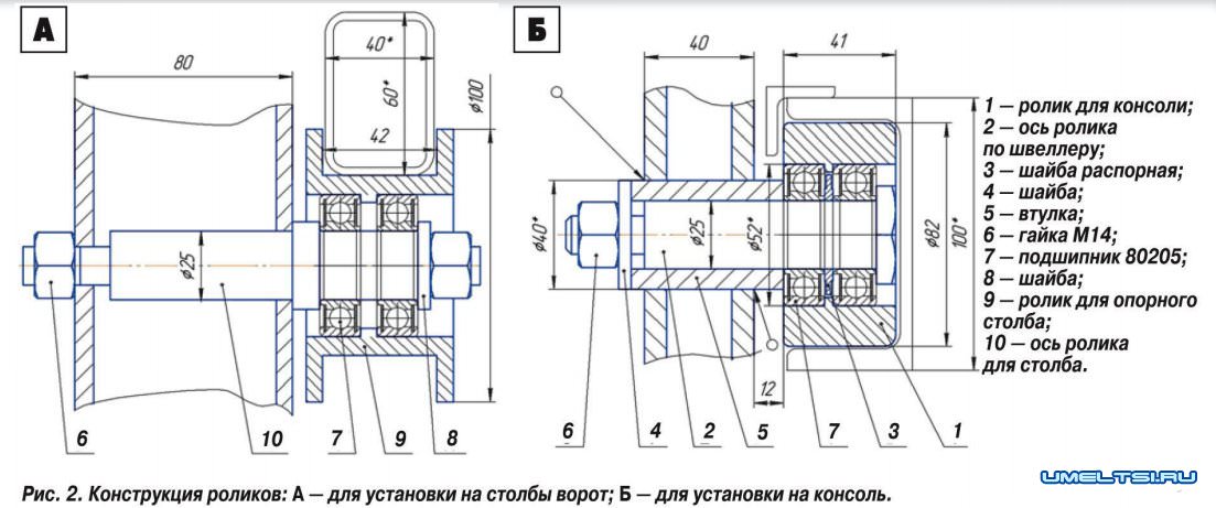 Каждый из роликов, по которым катится нижняя опорная труба, и тех, которые направляют движение верхней трубы рамы ворот, имеет корпус, ось, шайбу, два подшипника N980205 и гайку М14.