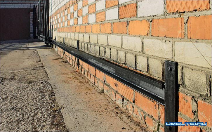 На следующий день в кирпичной стене насверлили глухих отверстий и болтами М12x140 мм на дюбелях закрепили пластины, на которые будет приварен направляющий швеллер. К швеллеру сваркой прикрепили отбойный уголок 25x25 и произвели первый прокат каркаса ворот на роликах. Всё получилось удачно.