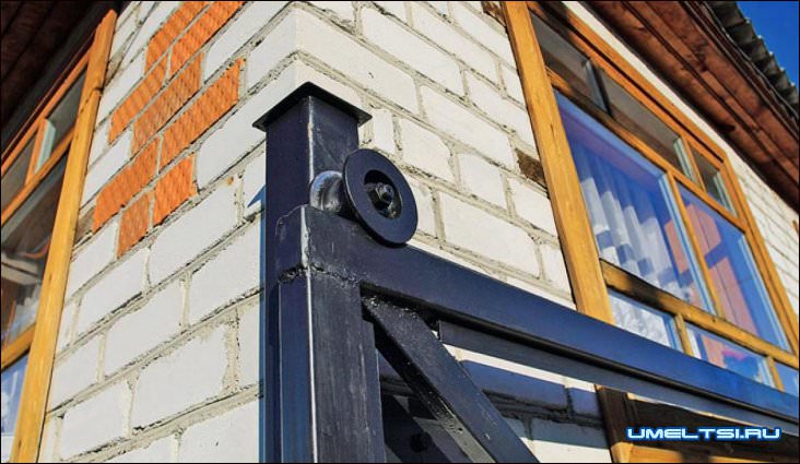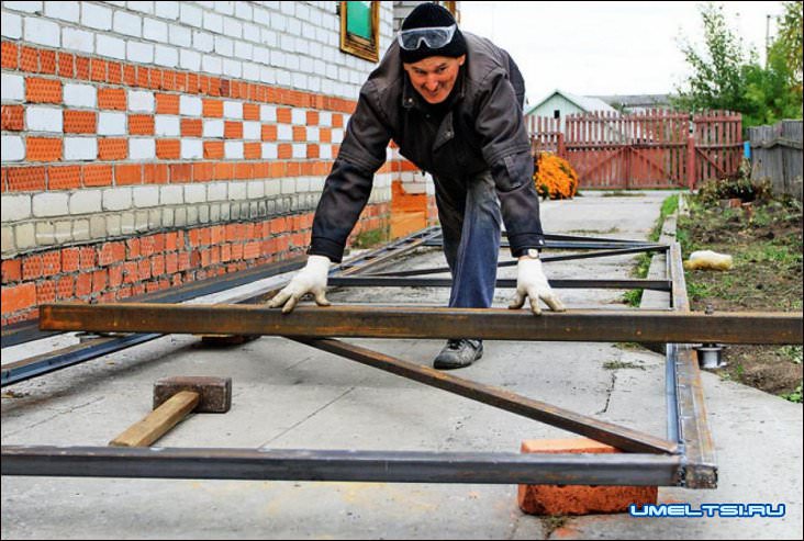 В первый день мы приступили к сварке каркаса ворот и подготовили ямы для опорных столбов, а во второй доработали каркас и установили к углу кирпичной веранды один из опорных столбов. Мы даже успели в нём просверлить отверстия для осей роликов на высоте 150 мм от земли и вверху, с учётом высоты полотна ворот 1800 мм.