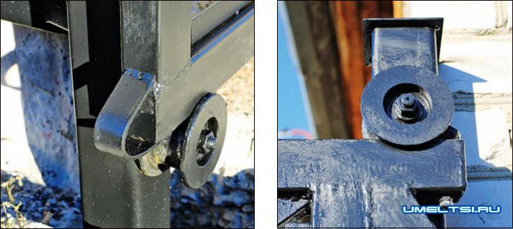 • правый (если смотреть на ворота со стороны двора) опорный столб из квадратной трубы 80x80x2500 мм с установленными на нём опорным и направляющим роликами;