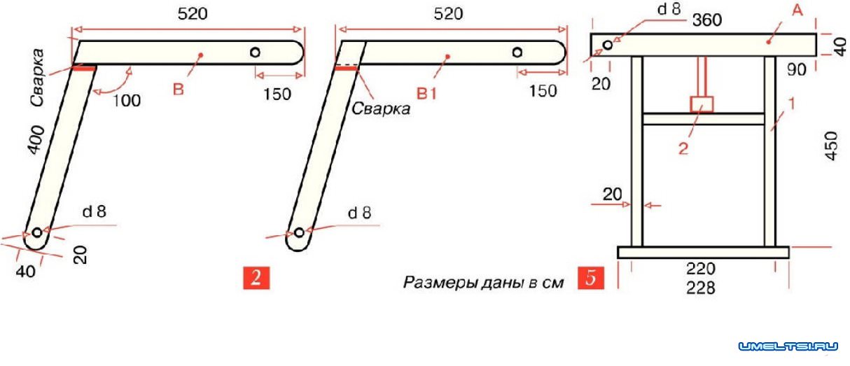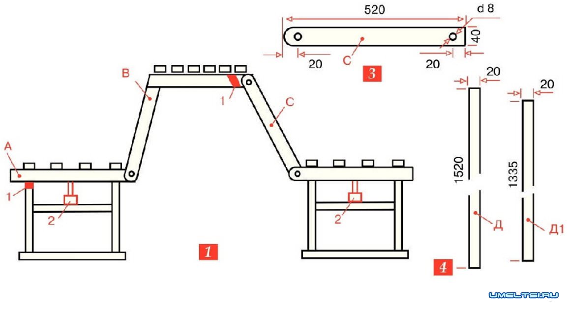 1 — ограничители положения В (труба 20x20 мм, длина 35-49 мм), 2 — опорный стержень (для придания жесткости конструкции приварил его к соединительной трубке посередине скамейки).