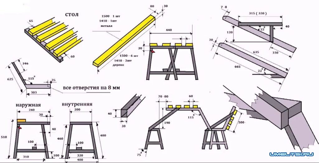 Каркас сделал из тонкостенных профильных труб разного сечения (рис. 1-5) В положении «скамойка» на ней свободно размещается 3 человека. При переводе в положение «стол» — 6 человек, по 3 с каждой стороны.