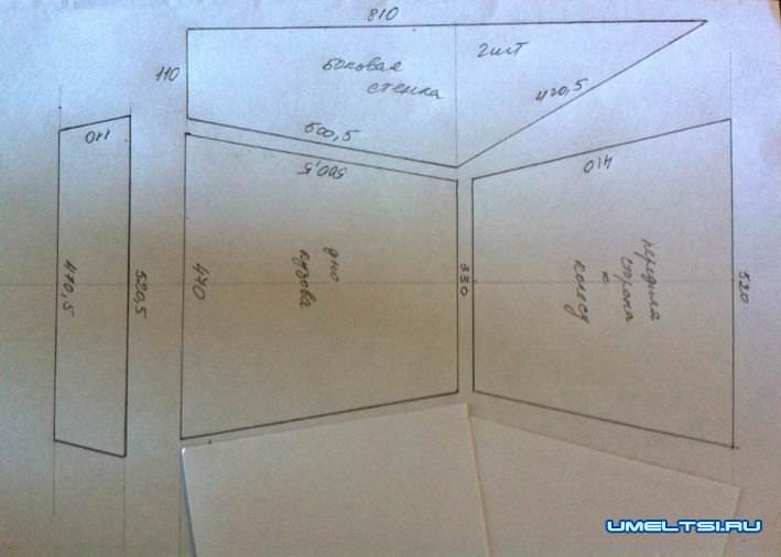Для кузова мы взяли лист металла толщиной 2мм (1м×1м). Еще 1-й лист металла вам понадобится на дно (330х470х500,5), 2-й лист для переда тачки (330 х520х410), 3-й, 4-й - для боков тачки (810х500,5х420,5х110), 5-й – для задней стенки (470,5х520,5х110).