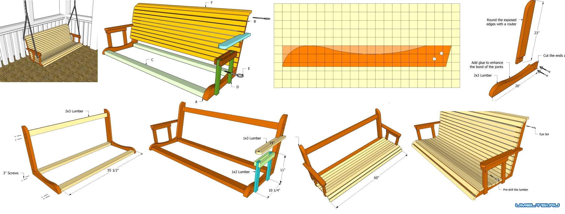 Ниже пошаговые фото, где предоставленные пошаговые схемы по созданию дивана для качели-перголы.