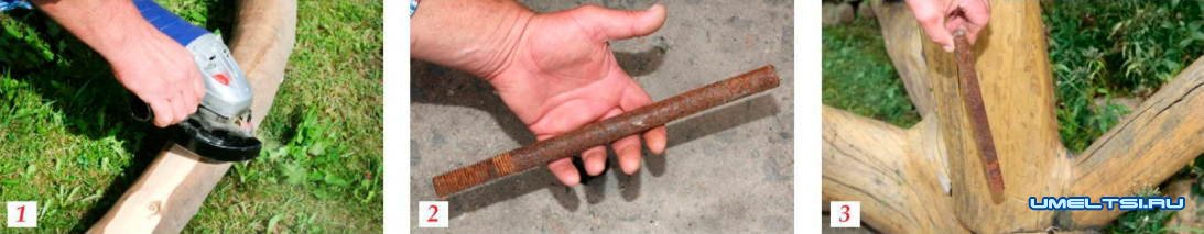 Подобрал подходящие по диаметру и форме ветки яблони, снял кору. Так как яблоня имеет свойство быстро чернеть без коры, перед сборкой изделия зачистил ствол с помощью болгарки с зачистным кругом большой абразивности (фото 1).