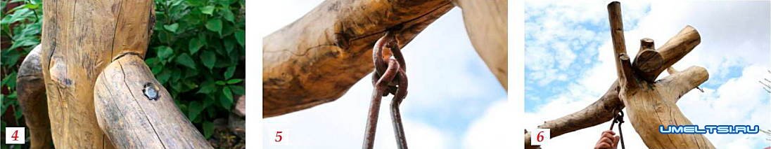 Сначала собрал низ и стойки. Все детали крепил на металлические резьбовые шпильки (фото 2). Чтобы стержень d 18 мм плотно входил в древесину, сверлил под него отверстие d 17 мм, предварительно наметив место стыка на нижней детали карандашом. Затем кувалдой забивал в эту заготовку шпильку и нанизывал на нее сверху стойку (фото 3). Временно фиксировал конструкцию дополнительными подпорками из веток, которые впоследствии убрал. Далее подобрал ветки для боковых элементов. Закрепил их аналогично на прутки меньшего сечения, в некоторых местах усилил винтами (фото 4).