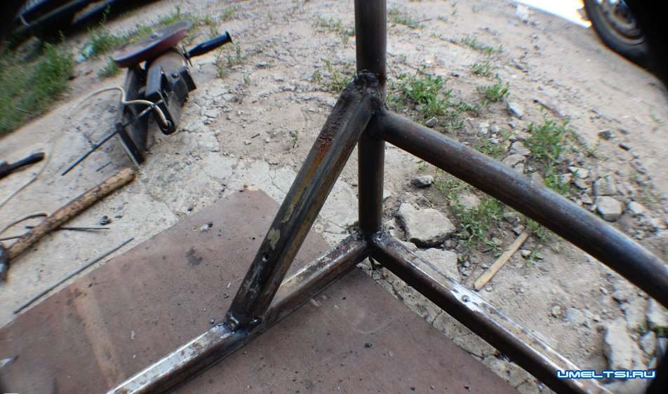 Под углом в 90 градусов я наварил раму из круглых труб.