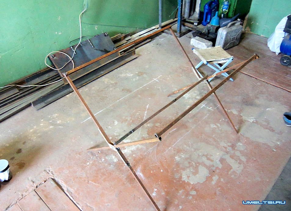 Половинки второй ножки прихватываем или саморезами или сваркой. Обязательно соблюдаем угол в 90 градусов.