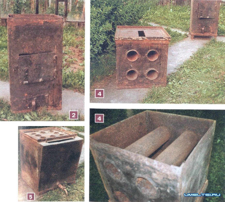 И ТОЛЬКО ТРЕТЬЯ конструкция оказалась и прочной, и удачной. Вес печного блока, как я уже говорил, 69 кг. Сделан он из стального листа толщиной 10 мм (можно использовать и 8 мм), сваренного по стыкам сплошным швом электродом диаметром 3 мм. Внутри на расстоянии 150 мм от пола приварен уголок 35x35. К нему приварены прутки (арматура) диаметром 15 мм с шагом 20 мм -сделан колосник. Имеются и дверки для топки и поддувала из стального листа толщиной 32 мм. Закрепил их на петлях.