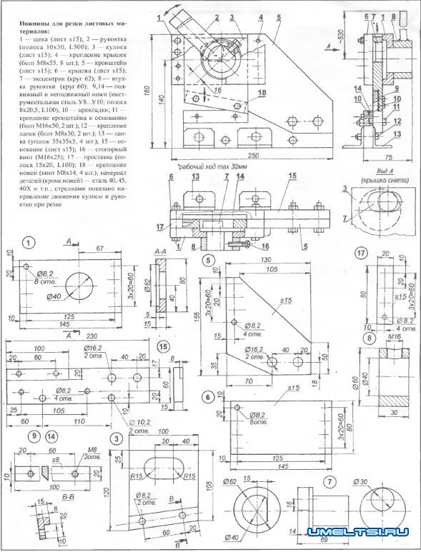 Резание металла осуществляется двумя 100-мм ножами, один из которых закреплен на неподвижном основании, а другой — на подвижной кулисе. Подача кулисы производится кривошипом с эксцентриситетом 16 мм (максимальный рабочий ход 32 мм), на хвостовике которого закреплена ручка. При ее длине 500 мм происходит увеличение приложенного усилия более чем в 30 раз, что позволяет достаточно легко резать стальной лист толщиной до 3 мм.