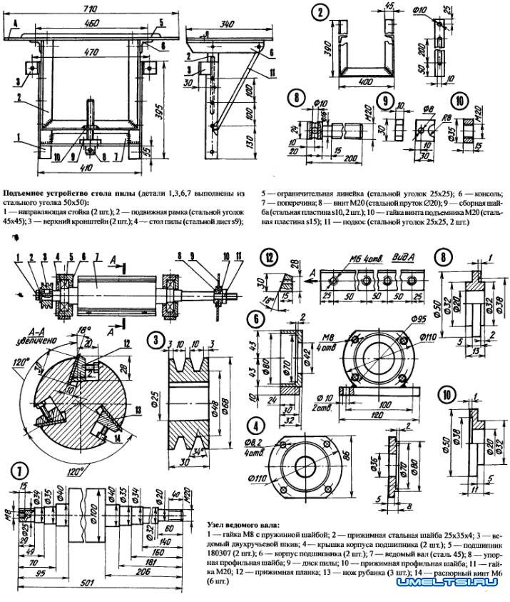 Для механизации подъема-опускания стола и более точной установки глубины пропила снизу под рамой смонтирован винтовой подъемник, закрепленный с помощью закладной шайбы на ригеле из уголка 50x50 мм. Винт длиной 200 мм — из стального прутка диаметром 20 мм, на нем нарезана резьба М20 до самой проточки около головки винта. Гайка винта приварена к горизонтальной полке нижнего уголка рамки. Наружные концы консолей дополнительно укреплены выполненными из уголка 25x25 мм подкосами. Сверху на столе, сбоку от прорези для пильного диска, сделаны несколько парных резьбовых отверстий М8 для перестановки и крепления ограничительной линейки, выполненной из уголка 25x25 мм.
