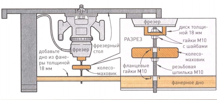 Сначала из заготовки толщиной 18 мм выпилите диск, на который будет опираться фрезер. Сверлом Форстнера диаметром 20 мм просверлите в центре диска углубление-цековку глубиной 1 3 мм, а затем сделайте в его центре сквозное отверстие диаметром 10 мм. Вставьте в просверленное отверстие резьбовую шпильку М1 0 и закрепите ее при помощи двух гаек с шайбами, как показано на рисунке. Длина шпильки должна обеспечить вертикальный ход фрезера, установленного в столе, около 50 мм. Затем закрепите чуть выше середины шпильки деревянное колесо-маховик для регулировки, используя гайку с шайбой и фланцевую гайку. Приклейте фланцевую гайку к шпильке с помощью эпоксидного клея.