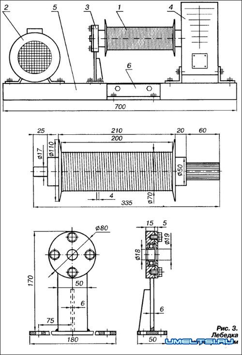 Лебедка 1 и электродвигатель 2 мощностью 1,5 кВт смонтированы на одной раме (рис. 3) и соединены клиновым ремнем. Барабан лебедки одним концом опирается на опорный подшипник 3, другим — при помощи шлицов связан с червячным редуктором 4, передаточное число которого 50.