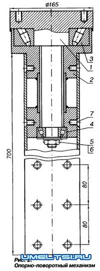 Опорно-поворотный механизм (рис. 2) состоит из поворотной 1 и неповоротной 2 частей. Опорно-упорные подшипники 3 (66314) и 4 (7605) запрессованы в неповоротной части при помощи гайки 5, зафиксированной стопорной шайбой 6. Это обеспечивает вращение поворотной части вокруг своей оси, но не позволяет ей перемещаться в осевом и радиальном направлениях. Неповоротная часть при помощи болтов 7 фиксируется в вертикальной стойке.