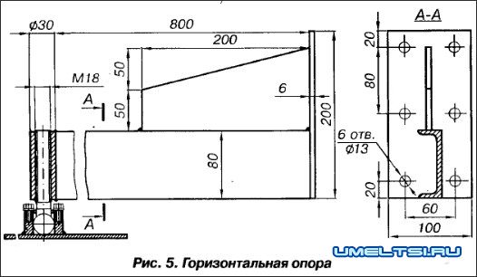 Вертикальная стойка 1 привернута болтами к горизонтальным опорам 2, которые стоят на регулируемых по высоте опорах 3. В вертикальной стойке смонтирован опорно-поворотный механизм 4.