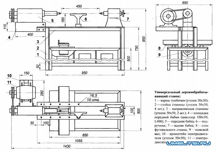 Площадка под переднюю бабку — это «коробка», сваренная из двух отрезков швеллера 100x50 мм длиной 400 мм и пары стальных пластин 400x100 мм толщиной 2 мм, соединённых винтами Мб. Кронштейн под электродвигатель — из уголков 50x50 мм длиной 280 мм, прикреплённых к площадке передней бабки. Сама же коробка привёрнута к консольным выпускам направляющих станины двумя болтами М12: один из них служит осью поворота коробки с передней бабкой, а второй — фиксатором горизонтального или вертикального её положения.