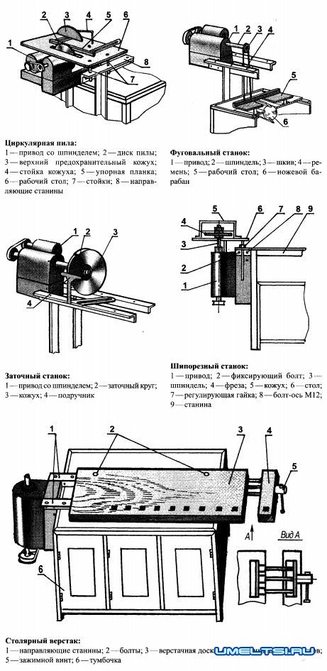 Фуговальный станок. Его стоп закреплен на каркасе тумбочки. Ножевой вал со сменными ножами — от электрорубанка. К валу прикреплен шкив диаметром 100 мм. Барабан установлен в левой части тумбочки, одно из отделений которой является стружкосборником. Для приведения ножевого барабана во вращение на шпиндель надевают шкив диаметром 80 мм. Обрабатываемый материал прижимается к столу роликом с пружиной, закрепляемым на направляющих (на рисунке не показаны). Подают материал вручную.