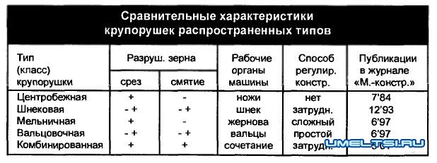 Заслуженной популярностью пользуются, например, центробежные крупорушки (см. рис. 1). Принцип их действия, да и сами конструкции во многом напоминают всем известную электрокофемолку. Зерно разрушается ножами, вращающимися с большою скоростью, интенсивный его срез происходит у стенок, куда сырье отбрасывается центробежной силой. Оперативной регулировки измельчения здесь не предусматривается (см. табл.); размер срезанной фракции определяется ячейками сита, а производительность — остротой ножей, их размерами и скоростью вращения.
