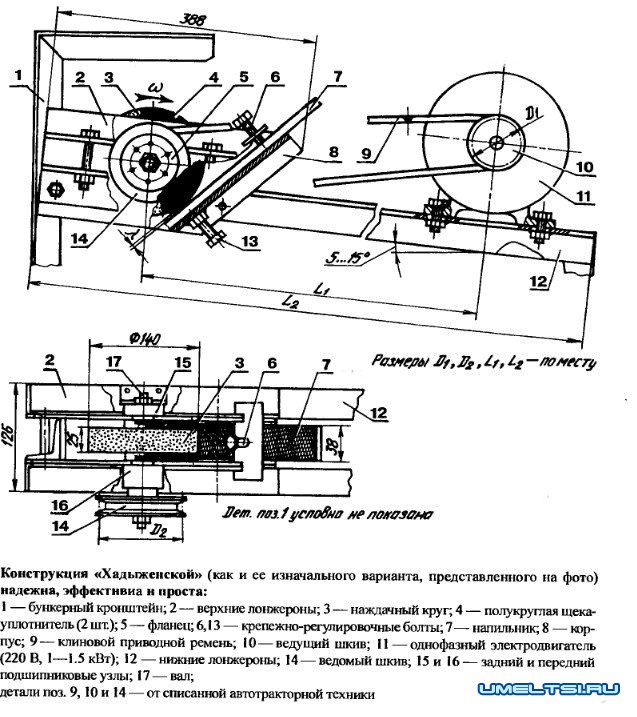 Драчевый напильник размещают на наклонной боковине (внутри корпуса крупорушки) таким образом, чтобы между его рабочим полотном с насечками и радиальной поверхностью наждачного круга выдерживался требуемый рабочий зазор, — для этого в конструкции измельчителя предусматриваются крепежно-регулировочный и регулировочный узлы. Фланец, устанавливаемый с помощью призматической шпонки на ведомом валу, служит для быстрой установки любых шкивов, в том числе — от автомобильных двигателей.
