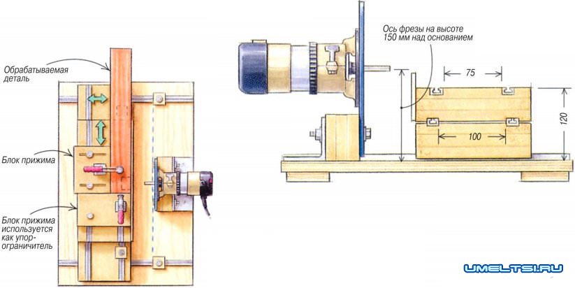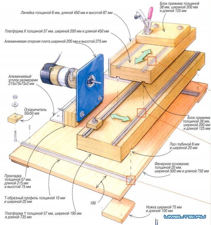 Самодельный инструмент должен объединять горизонтально закреплённый фрезер, стол, который может передвигаться по осям X и У, ограничители, контролирующие ширину и глубину паза, а также систему контроля положения и крепления детали.