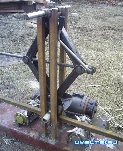 Лебедку и один из роликов необходимо соединить общей цепью и закрепить внизу стойки, другой – выше на вертикальной части.