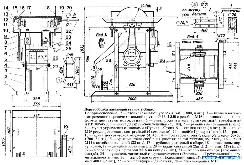Вынесенный на суд читателей сайта umeltsi.ru деревообрабатывающий станок я самостоятельно спроектировал, собственноручно изготовил и теперь успешно использую при строительстве дома на своем участке. Убеждаюсь, насколько удачной получилась конструкция: компактная, технологичная, вполне, думается, подходящая для ее «тиражирования». Станок настолько прост, что сверхобстоятельная деталировка для его изготовления вряд ли потребуется. Ко всем узлам крепления здесь свободный доступ. Так что при желании конструкцию можно легко разобрать и, перевезя в багажнике автомобиля, собрать на новом месте минут за тридцать.