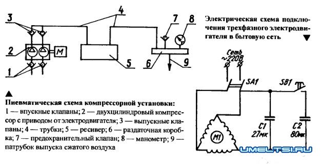 В качестве привода компрессора использовал трехфазный электродвигатель переменного тока мощностью 1 кВт с числом оборотов 1380 в минуту, с соединенными «треугольником» обмотками, переделанный для работы с питанием, от бытовой электросети напряжением 220 В. Конечно, лучше было бы установить двигатель поменьше и однофазный, но как это чаще бывает у самодельщиков, — использовал и приспосабливал то, что имел.