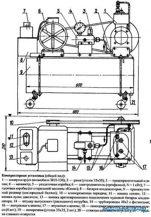 Главный механизм — двухцилиндровый компрессор от автомобиля ЗИЛ-130. Он и стал «сердцем» установки. Основной же образующий и несущий элемент агрегата — глушитель от автомобиля КрАЗ. В установке он выполняет роль ресивера и на нем смонтирована простая рамка из уголка 35x35, а на ней — все узлы и механизмы. Под ресивер подведены две поперечины из такого же уголка (соединенных с рамкой парой шпилек каждая), а на их концах закреплены четыре самоориентирующихся колеса.