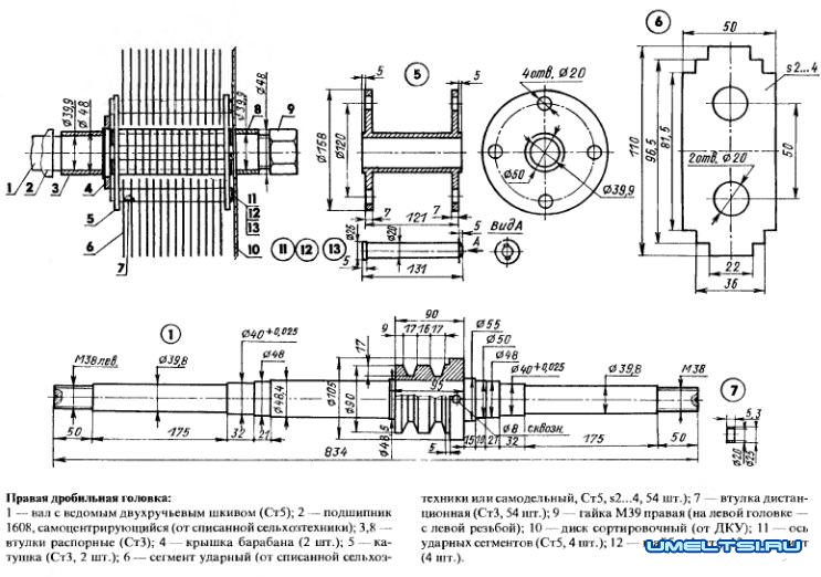 Вал дробильных головок вытачивается из стали марки Ст5. Двухручье-вой шкив крепится на нем шпилькой М8 под отвертку и контрится гайками с шайбой Гровера.