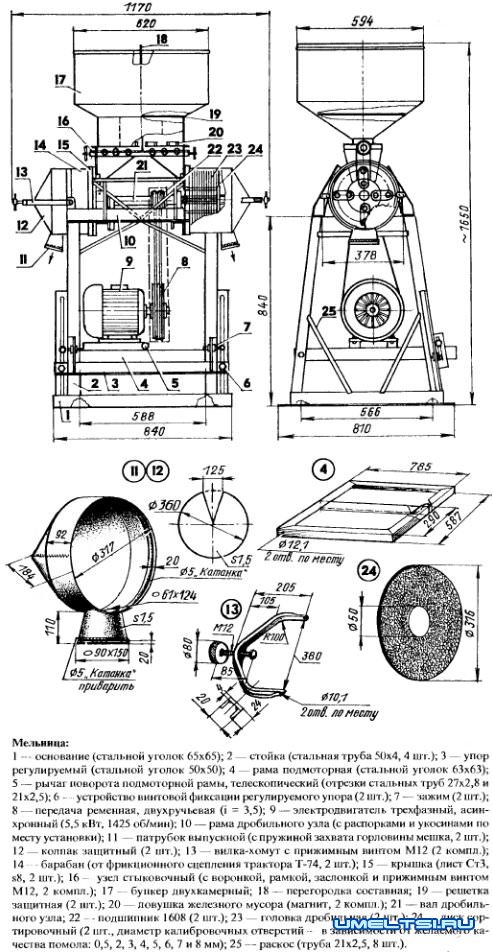 Приводной вал — один на обе дробильные головки. Такая мельница хоть и сложнее одноконтурной, но имеет более высокую производительность (что немаловажно для большого фермерского хозяйства). Ну, а если дробильно-мелющая самодельная установка делается в расчете на обслуживание небольшого подворья, то можно упростить конструкцию, убрав одну дробильную головку и перегородку в бункере, а второй конец вала, оказавшийся свободным, использовать в других хозяйственных целях.