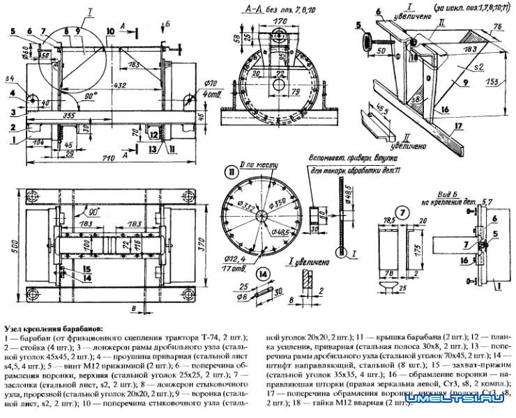Теперь нужно точно замерить высоту от подошвы корпусов до соответствующей поперечины, на которую они будут устанавливаться. Для ликвидации зазоров можно применить временные бруски из дерева. По данным размерам подточить П-образные вставки из швеллера 50x30 мм. В них надо просверлить отверстия под болты М14 для крепления корпусов, добиваясь, чтобы последние были перпендикулярны раме и параллельны между собой. После этого установить корпуса на подготовленные для них места и снова собрать мельницу. Строго отрегулировать вал по оси барабанов и приварить доработанные П-образные вставки к поперечинам рамы дробильного узла.