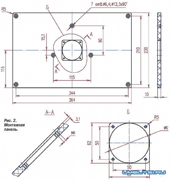 Для изготовления монтажной пластины (рис. 2) я использовал 10-мм лист лавсанового текстолита. Местоположение крепёжных отверстий с подошвы фрезера перевёл на бумагу, а с бумаги — на пластину. В центре пластины сделал отверстие d61 мм и в нём отфрезеровал фальц для установки сменных вкладышей под конкретную фрезу.