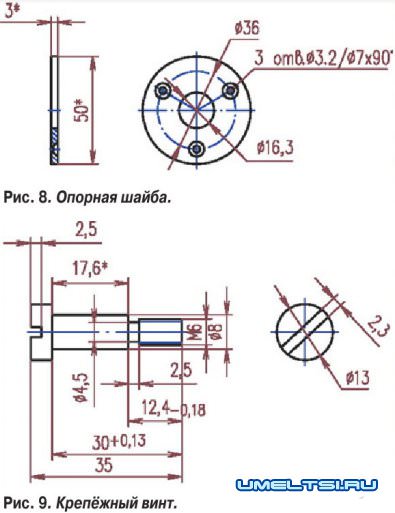 Для предохранения подшипника от опилок и другого мусора я закрыл его экраном, вырезанным из консервной банки. На рисунках 6-10 представлены чертежи всех деталей лифта.