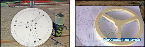 Штурвал (рис. 5) изготовил из берёзовой фанеры толщиной 20 мм. На плоттере напечатал контур штурвала в масштабе 1:1, наклеил рисунок на фанеру и с помощью электролобзика вырезал лишние сектора. Для компенсации закручивающей силы на фрезере между ним и болтом закреплён упорный шариковый подшипник 8110 (ГПЗЗ-2), который нашёлся в гараже. В принципе, можно поставить любой опорный подшипник, походящий по размерам.