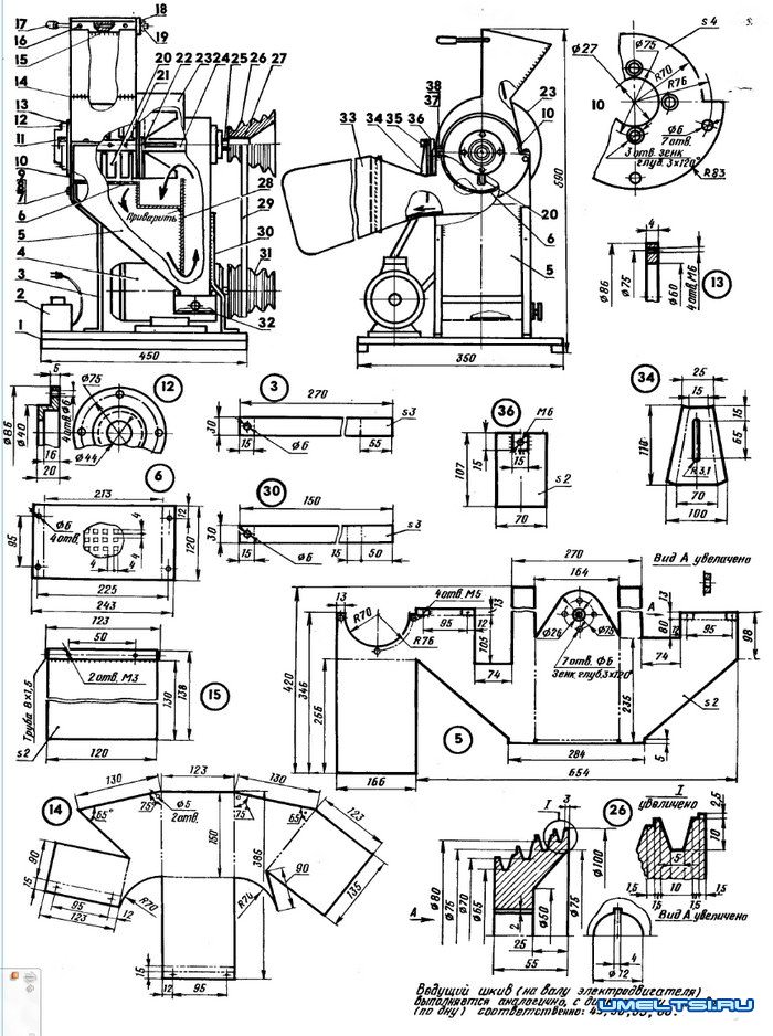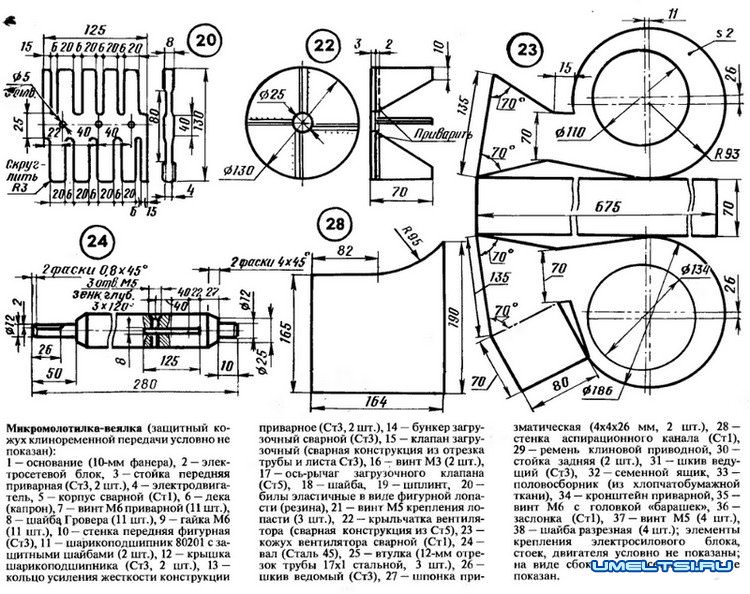 Корпус у микромолотилки-веялки сварной, выполнен по развертке (см. рис.) из листовой стали. Или литой — из алюминиевого сплава. Ну а конфигурация его такова, что позволяет практически полностью исключить сортовое засорение зерна. При минимальных габаритах это приводит к снижению затрат на изготовление, существенному уменьшению массы всей молотилки. Корпус к опорной деревянной площадке-основанию крепится на передних и задних металлических стойках. В его передней части расположен молотильный барабан. Фигурная передняя стенка и загрузочный бункер выполнены съемными. Тем самым во многом облегчается процесс монтажа узла центрального (основного) вала, -заметно снижаются трудозатраты, связанные с необходимостью перезамены деки (для каждого вида обрабатываемого урожая — зерновые, бобовые и т.п.— своя дека).