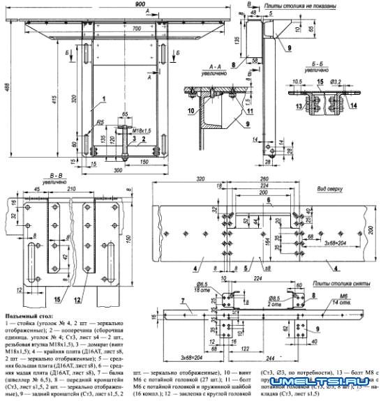 При работе с дисковой пилой к рабочему столу пристыковывается подъемный столик (по длине он тако.й же, как и рабочий стол, но поуже), на котором закрепляется болтами направляющая с упорами. Подъем-опускание этого столика осуществляется передвижением его рамки на раме станка. Конструкция рамки на фото и чертежах немного разная1 сначала верхняя балка рамки крепилась к стойкам болтами (на фото), а затем балка была приварена к стойкам сверху (на чертеже). На плите подъемного стола монтируется направляющая с упорами. Направляющую можно устанавливать под углом до 45° относительно плоскости стола, чтобы можно было выполнить косой срез заготовки (у конструкции на фото такой возможности еще не было — она доработана, и это отображено на чертеже). Этот же стол обеспечивает регулировку необходимой глубины резания дисковой пилой.