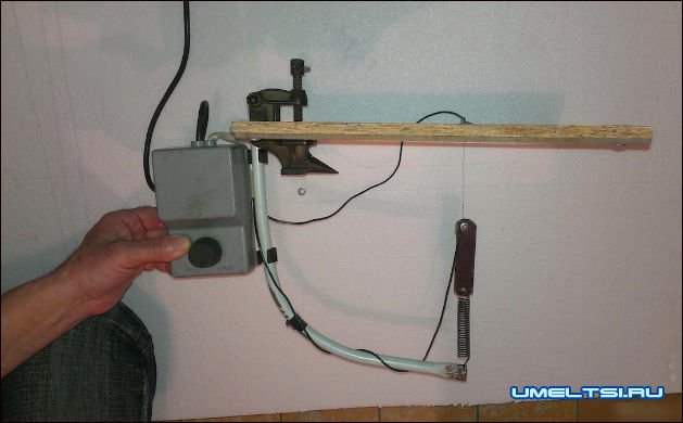 На станине закрепили дугу, а на дуге — выжигатель. Туда же укрепили пружины и натянули струну. Провода от выжигателя подключили к струне. Наш станок готов к работе.