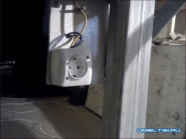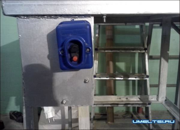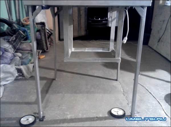 Также два болта приварил к ножкам стола, на них одел старые колеса от велосипеда ребенка. Сами колеса закрепляются гайкой, а контрогаются гайкой-барашкой. Розетку я решил приварить к ножке. Ее я закрепил на металлической пластине, там же сделал и кнопку включения. При помощи пластиковых стяжек фиксируется режим включения.