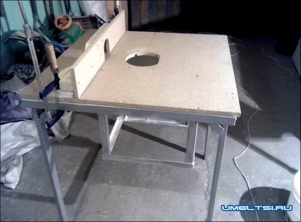 Высоту выбрал стандартную – 90 см, полотно стола подготовил размером 80 х 80. На месте будущей столешницы я подготовил отверстие в плите под фрез и сделал пазы под крепеж: я направил с циркуля фрезера прижимы, которыми и закрепил на столе сам фрез к столешнице. Решил сделать под поверхностью несколько дополнительных опор и сварил каркас для «лифта» установки. Все металлические детали необходимо покрасить, желательно прогрунтовать перед этим.