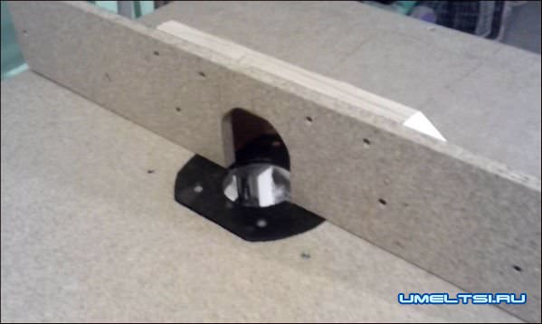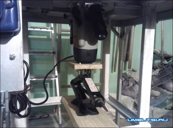 Автомобильный домкрат я использовал для изготовления лифта, к нему прикрепляется кусок доски, в которой необходимо просверлить отверстия для вентиляции фрезера. По углам закрепляются шпильки, они опираются на болты крышки фрезера. Если посмотреть на фото, то можно увидеть зазор между доской и крышкой фрезера. Если вы хотите сделать регулировку по высоте, необходимо помнить и о кнопке-фиксаторе. Боковой упор закреплен к столешнице при помощи струбцин.