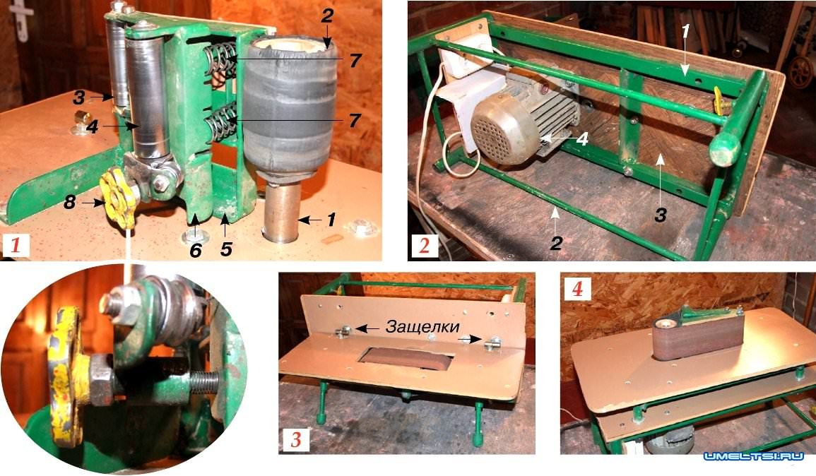 На вал мотора выточил металлический переходник (фото 1 п. 1) Направляющий ролик d 60 мм (2) вырезал из деревянного кругляша. Отрезал от него кусок длиной 80 мм (ширина шлифовальной ленты), просверлил в торце по центру сквозное отверстие по наружному диаметру переходника, на котором и закрепил эту деталь. Деревянный «бочонок» обтянул велосипедной камерой в несколько слоев.