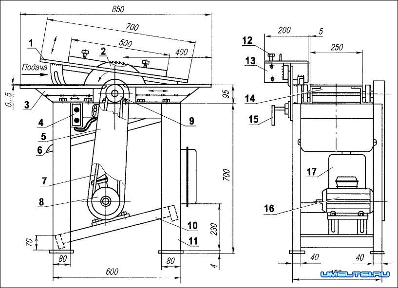 II — рама станка; 12 — направляющая-линейка; 13—шарнир подъема пильного стола; 14—роторный вал: 15—зажим для фиксации пильного стола в поднятом положении; 16—электродвигатель (U = 380 В, п=3000об/мин,К=ЗкВт); 17—электрораспределительный щит.