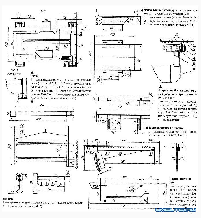 Распиловочный стол представляет собой плиту, выполненную из стального 10-мм листа. Снизу к плите приварен усилитель из стального уголка 35x35 мм. С одного конца усилителя к нему и к плите приварен сектор регулировки подъема стола, а около другого конца — кронштейн из такого же уголка. В обеих деталях выполнены совместно отверстия для оси крепления распиловочного стола к раме. Ось — болт М12, вставленный во втулку стойки, приваренной к раме. Распиловочный стол снабжен переставной направляющей для заготовок, выполненной из равнополочного уголка 40x40 мм.