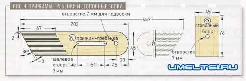 3. Просверлите в прижимах N отверстия диаметром 7 мм для подвески и щелевых отверстий (см. рис. 4). Разметьте края щелевых отверстий параллельными линиями и выпилите их с помощью электролобзика или лобзикового станка, затем ленточной пилой выпилите закругления на верхних концах прижимов. Отшлифуйте прижимные гребенки наждачной бумагой зернистостью 220 единиц.
